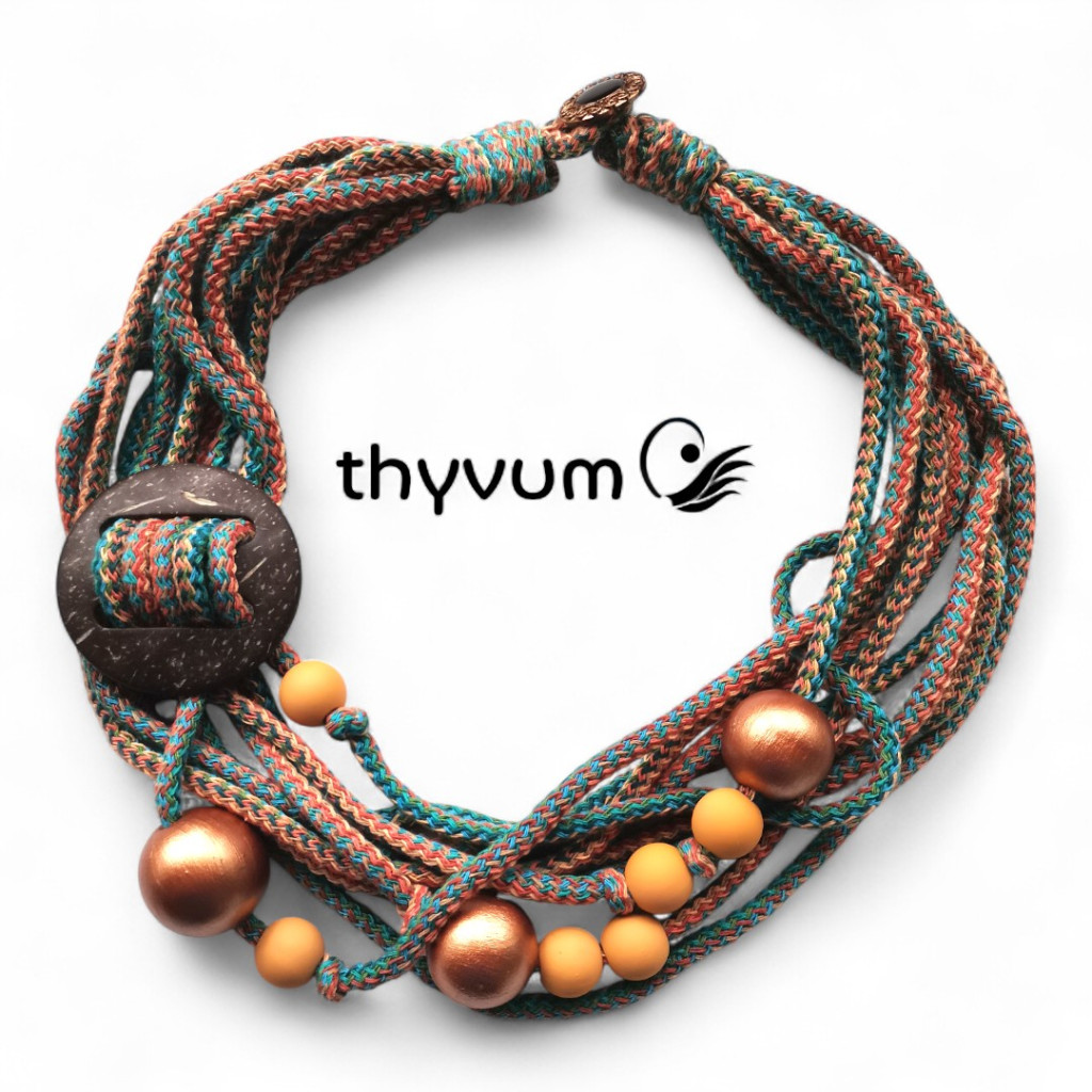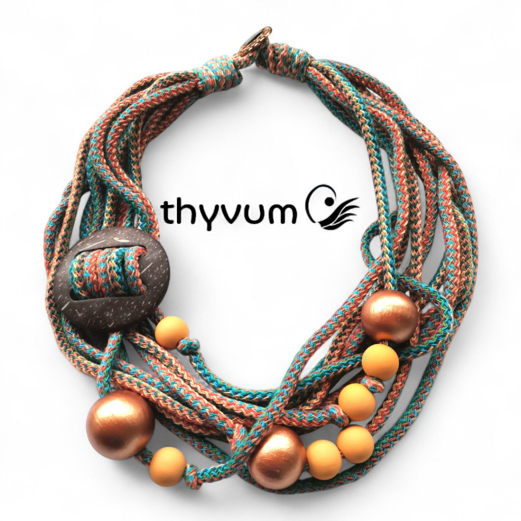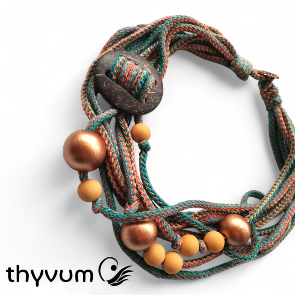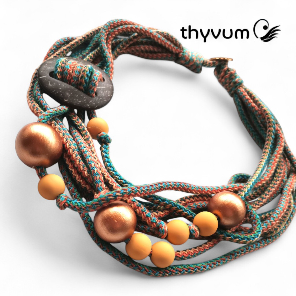 A kézzel fonott, türkiz–narancs árnyalatú zsinórok között bronzosan csillanó réz és napsárga fagyöngyök ragyognak – finom egyensúlyt teremtve a modern és a bohém stílus között.