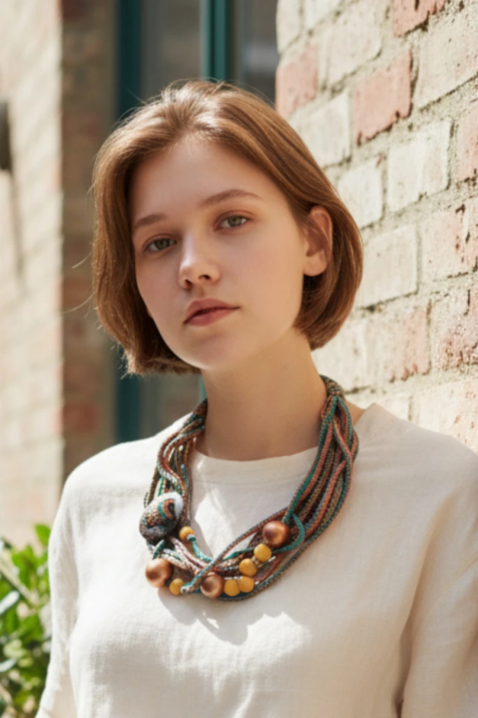 A Thyvum Aurora fonalnyaklánccban a természetes textúrák és a fémes fények találkoznak.
