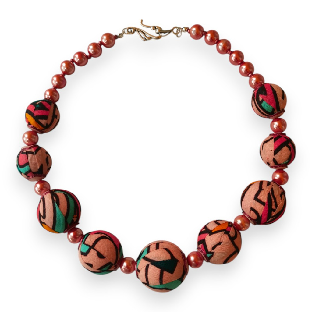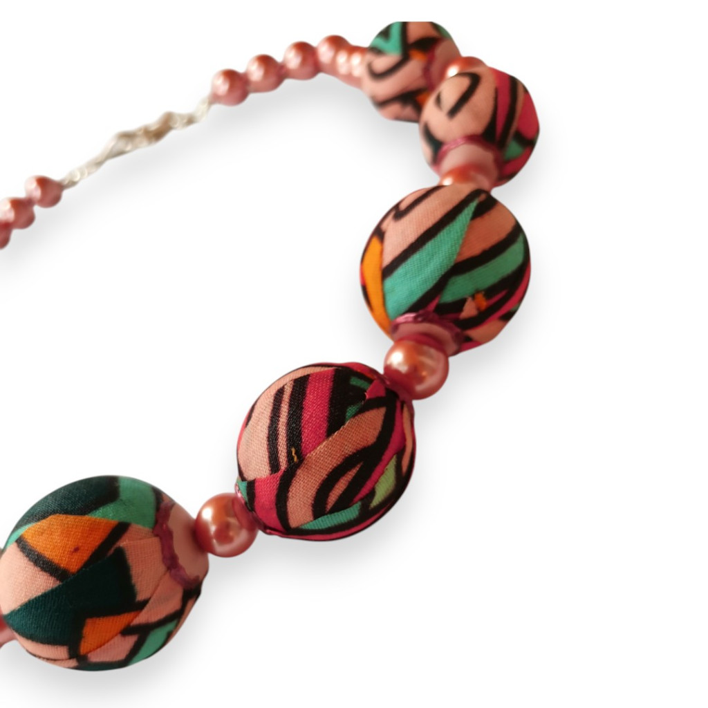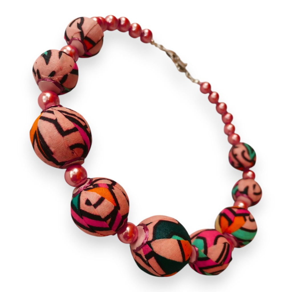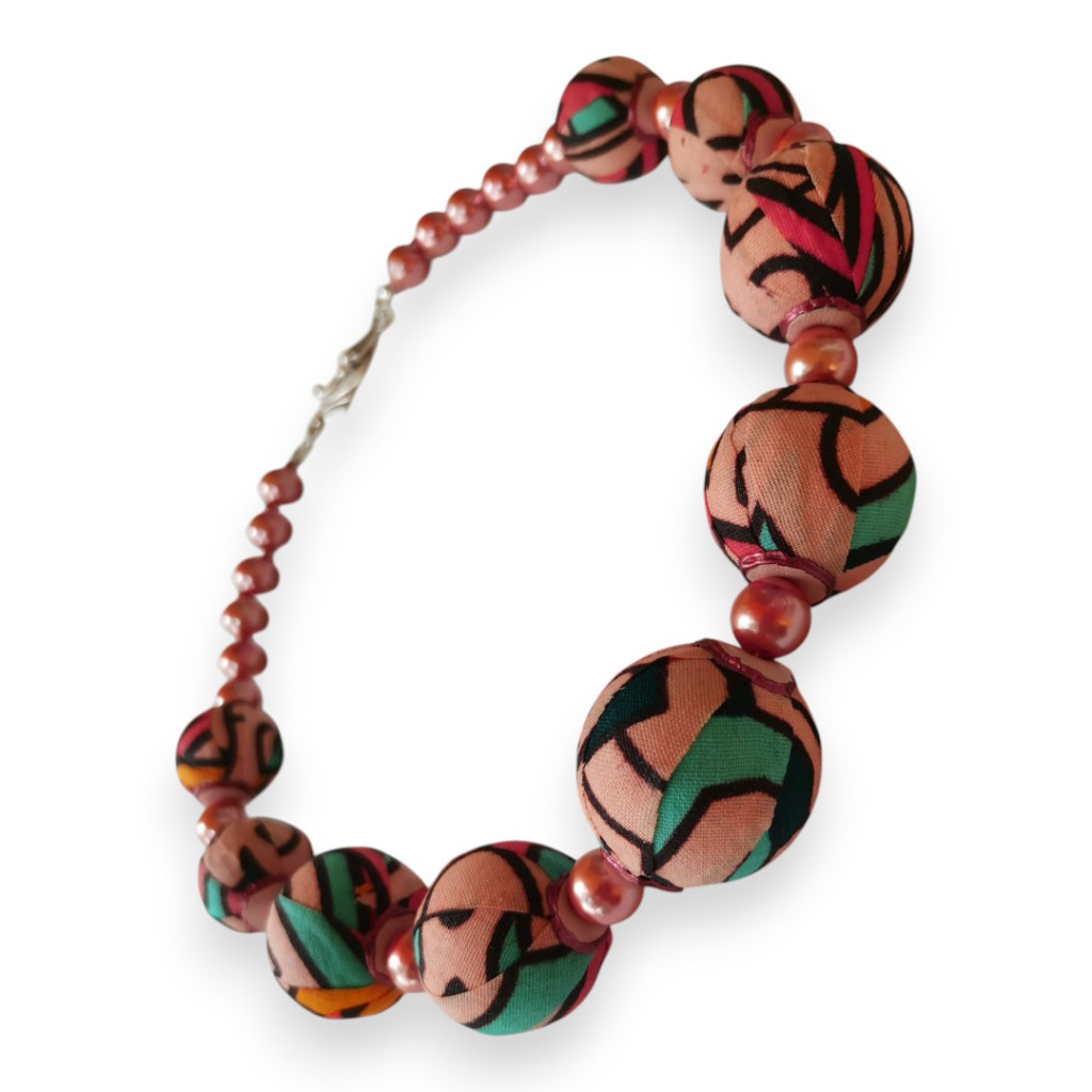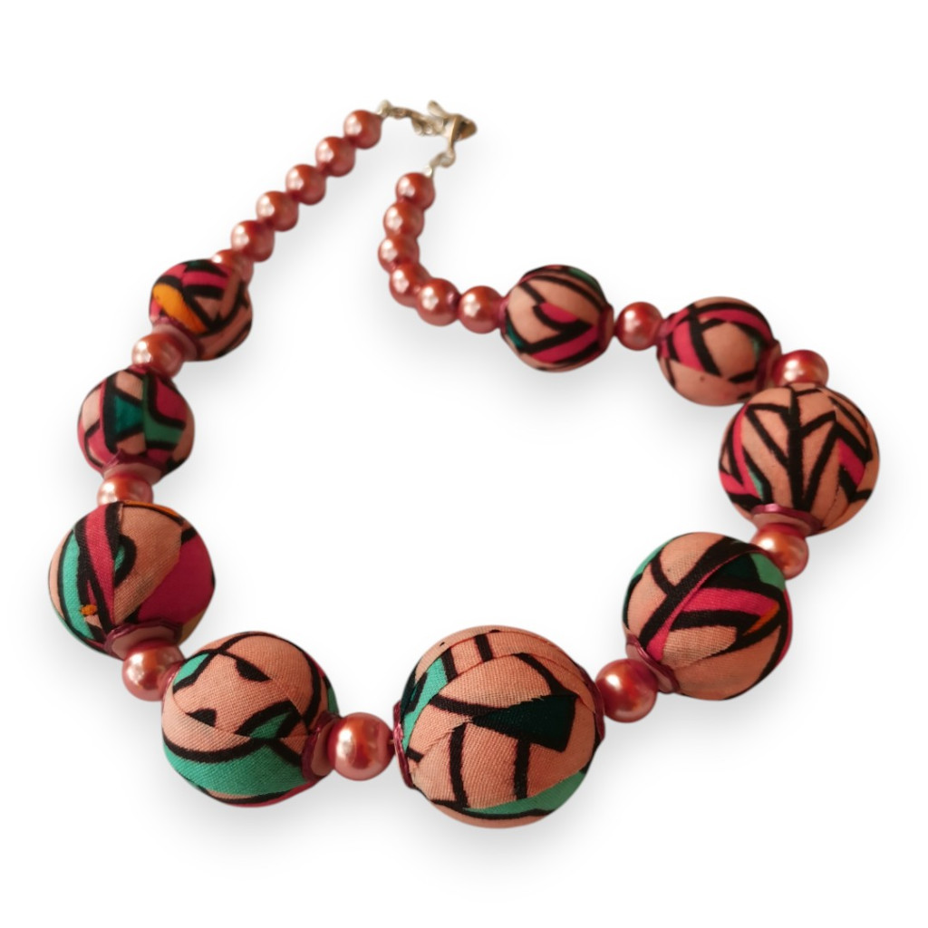 A Bubble Berry nyakláncnak afrikai textilbe öltöztetett, határozott formájú fagolyók adják a karakterét, amik mellett az apró, fényes üveg teklagyöngyök épp annyira elegánsak, hogy kiemeljék a rózsaszínes forgatagot. A színei és mintái viszont cseppet sem visszafogottak: puncs, málna, lazac, narancs, fukszia, zöld és fekete – igazi kavalkád, amitől a Bubble Berry a nevéhez méltón életre kel.