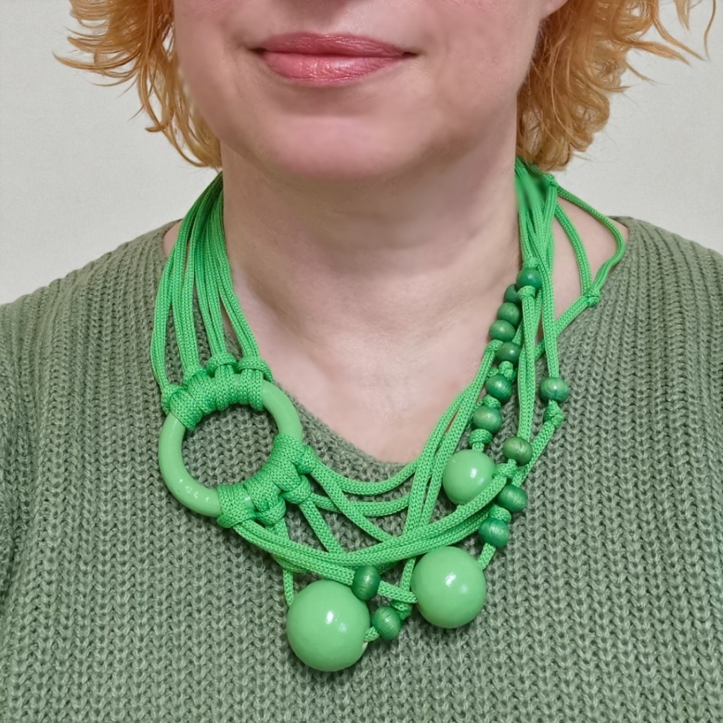 A puha fonalak és fényes gyöngyök játékos harmóniát alkotnak, csupa energia és a városi lendület találkozása.