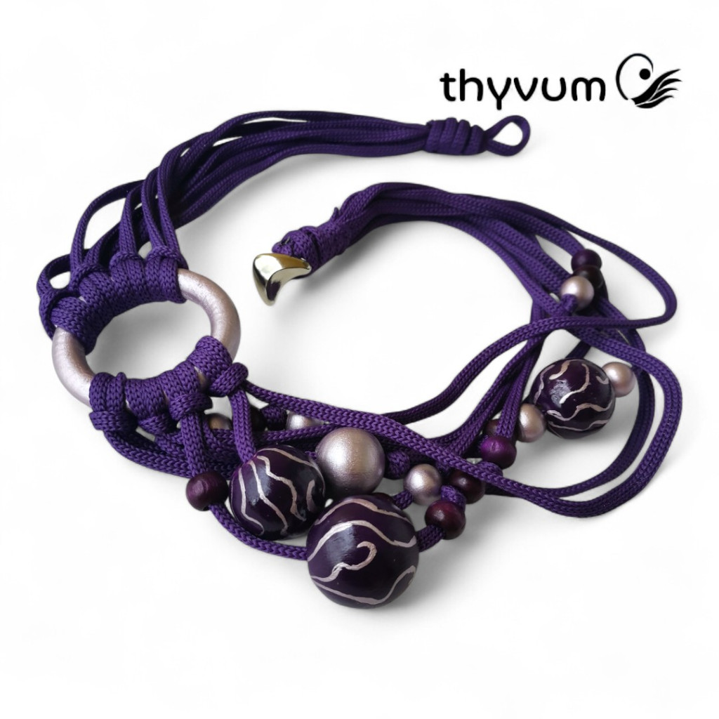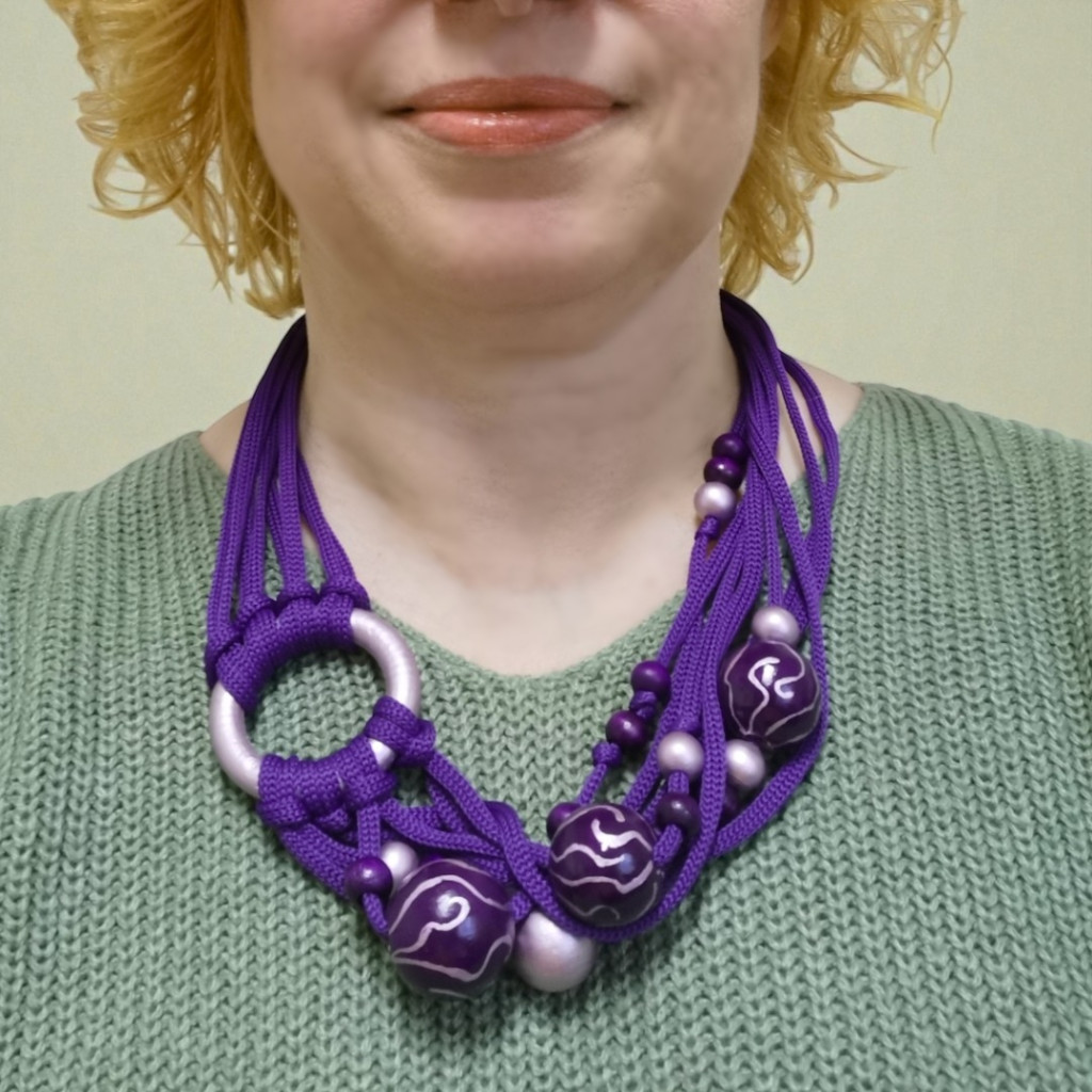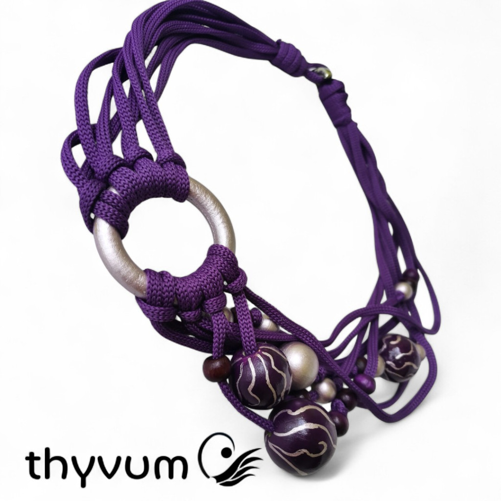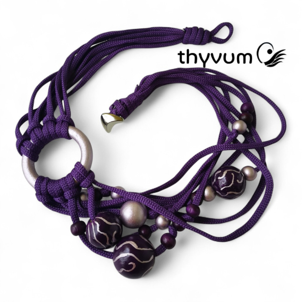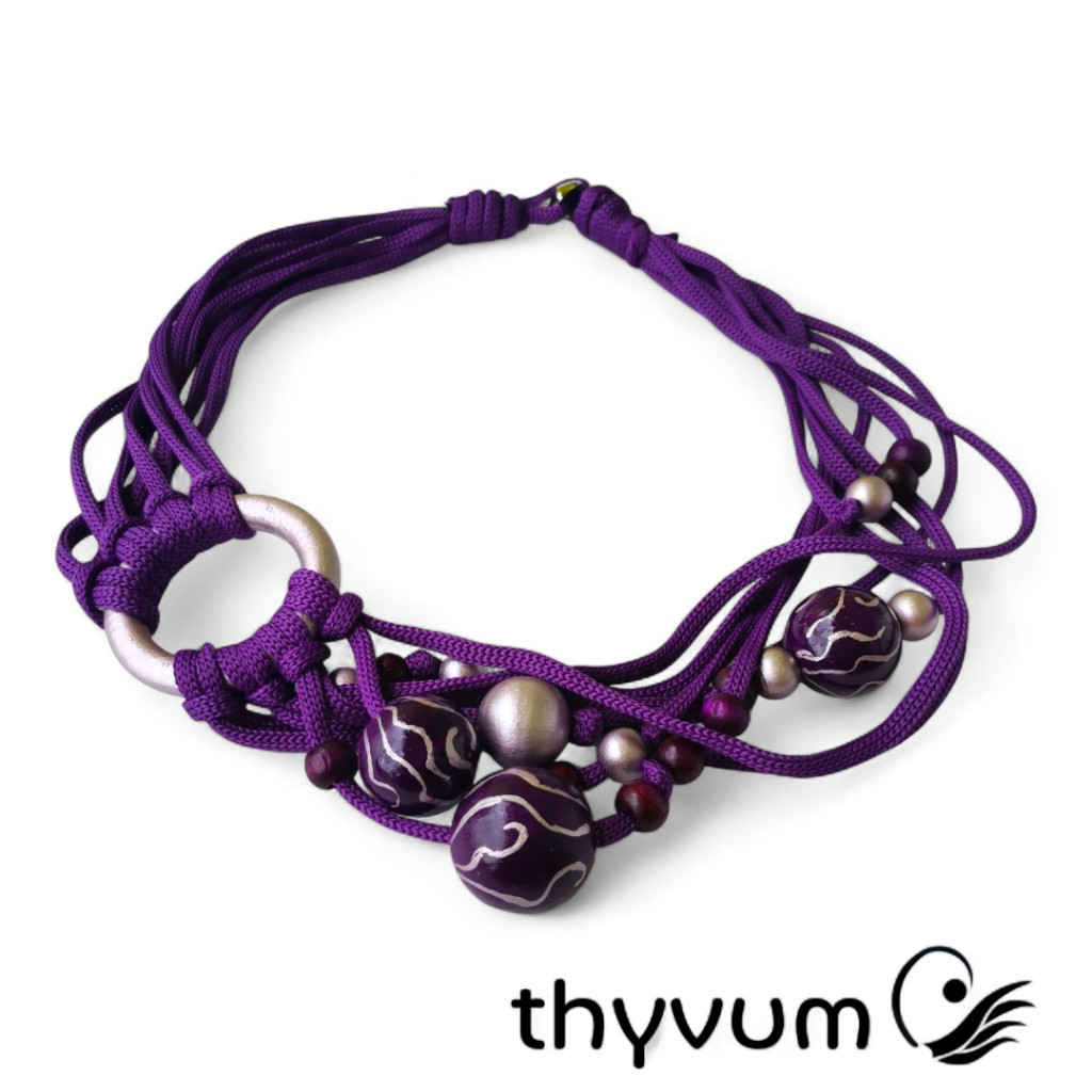 Ez a különleges, kézzel készült nyaklánc a mélylila árnyalatait ötvözi egy csipetnyi ezüstös, metálfényű lilával.