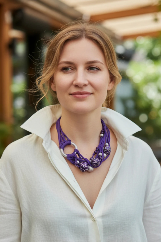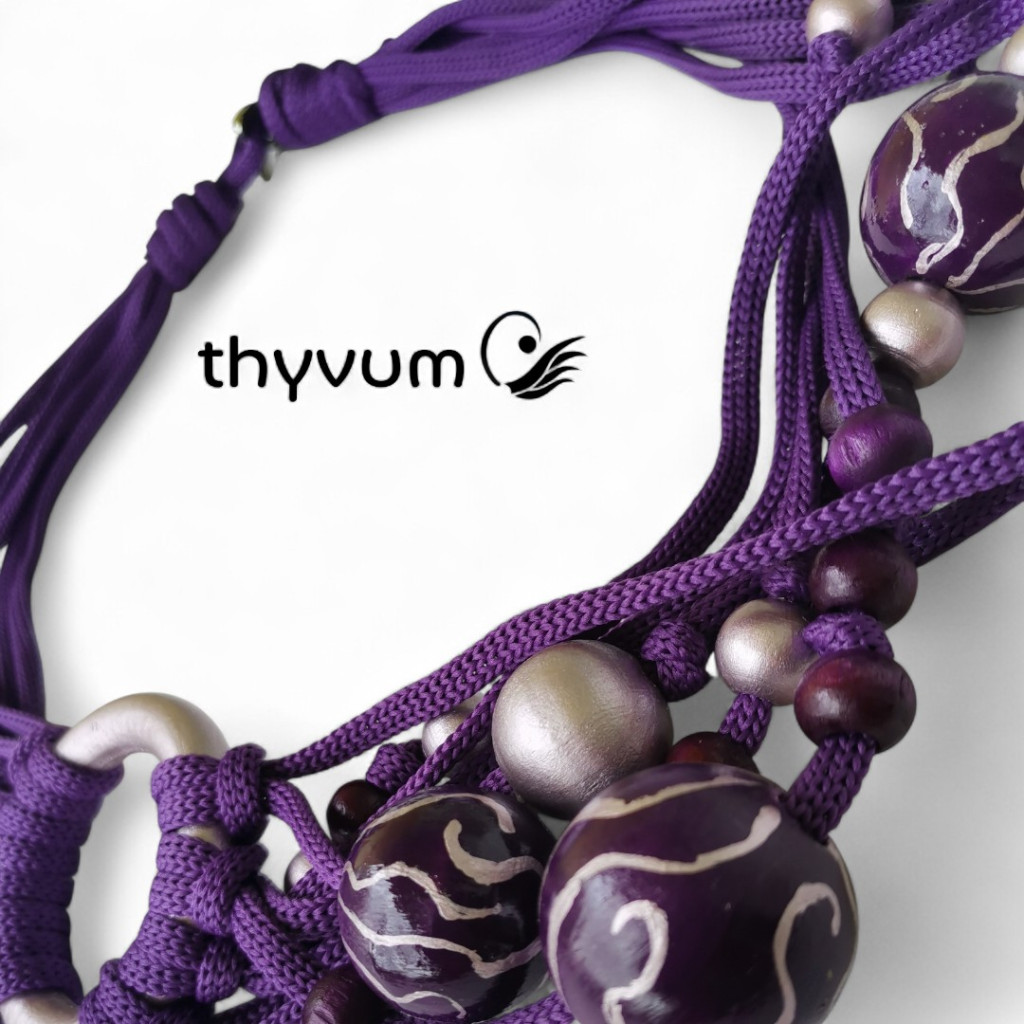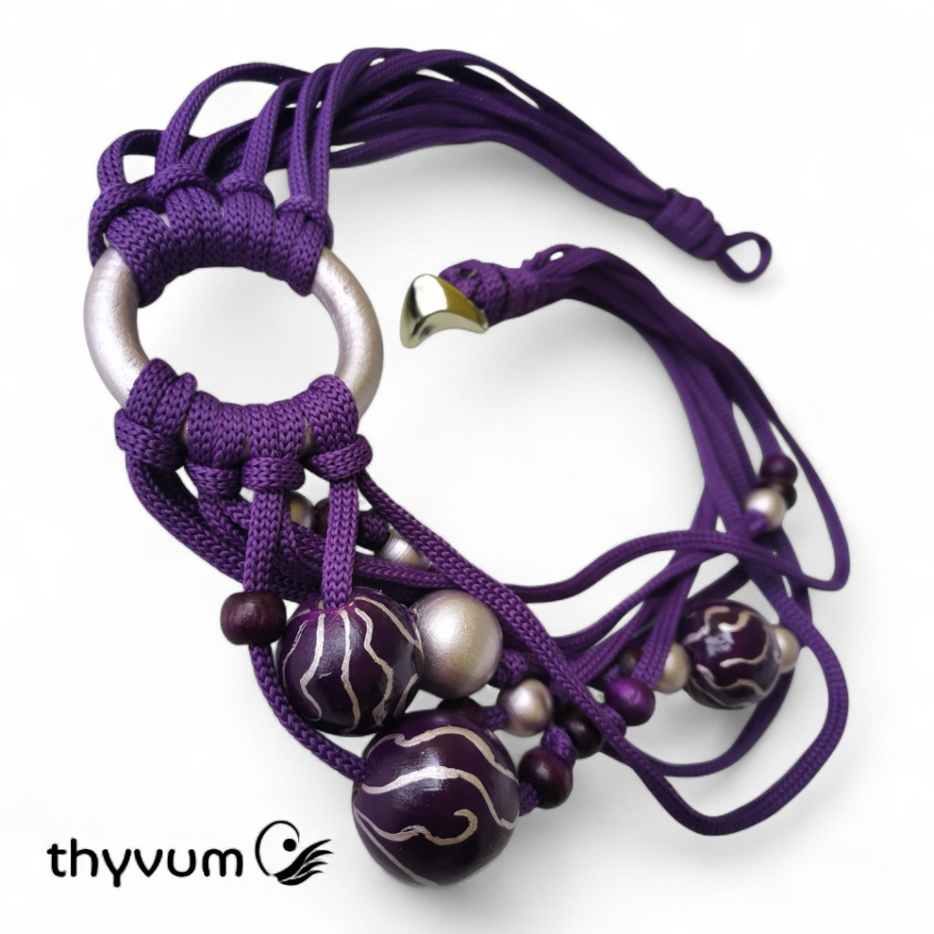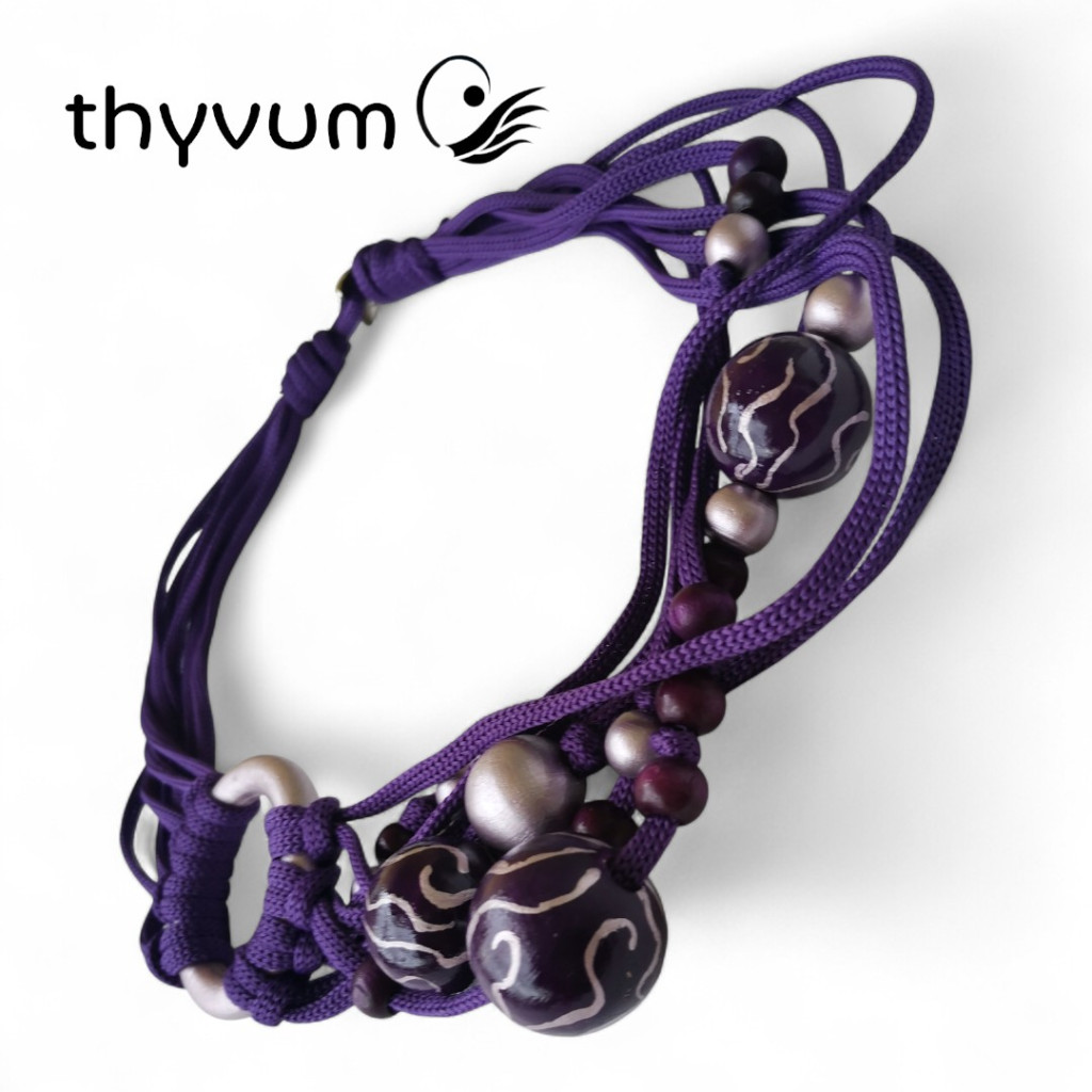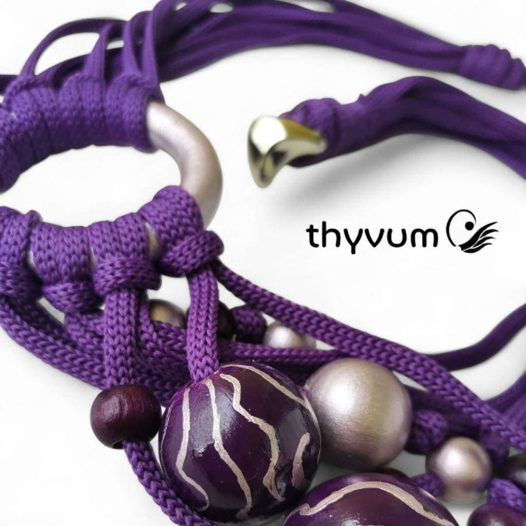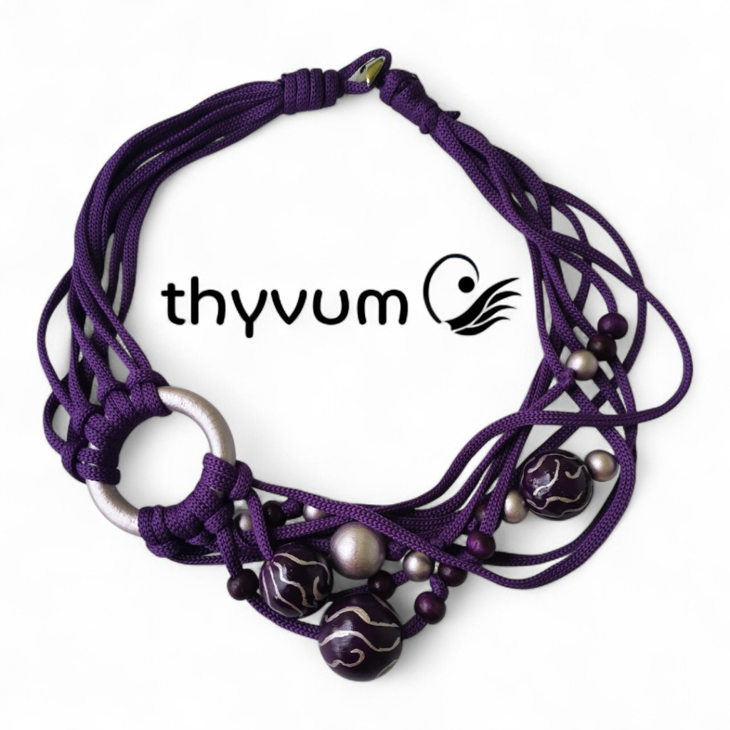 Ez a különleges, kézzel készült nyaklánc a mélylila árnyalatait ötvözi egy csipetnyi ezüstös, metálfényű lilával.