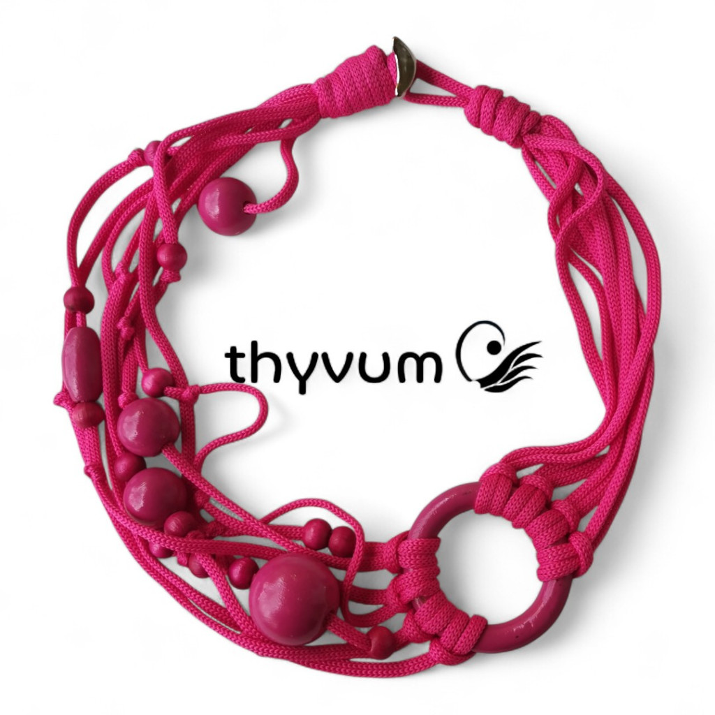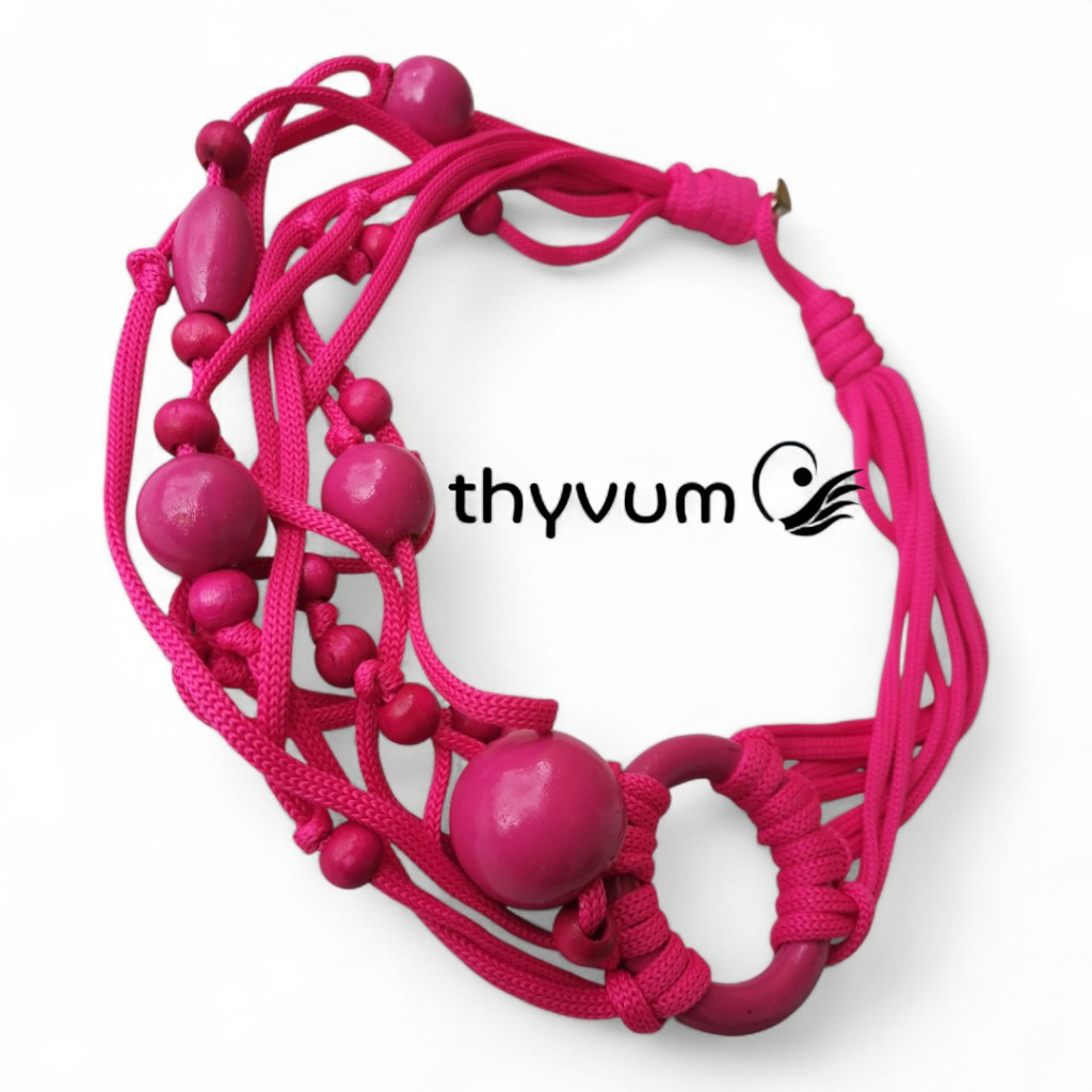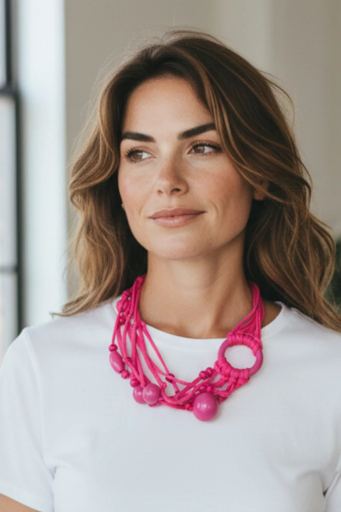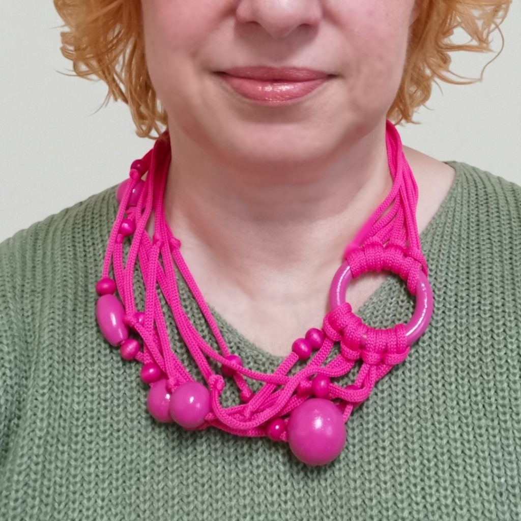 Ez a különleges, kézzel készült nyaklánc a igazi élénk pink színben pompázik, még a gyöngyök is pink árnyalatot öltöttek.
